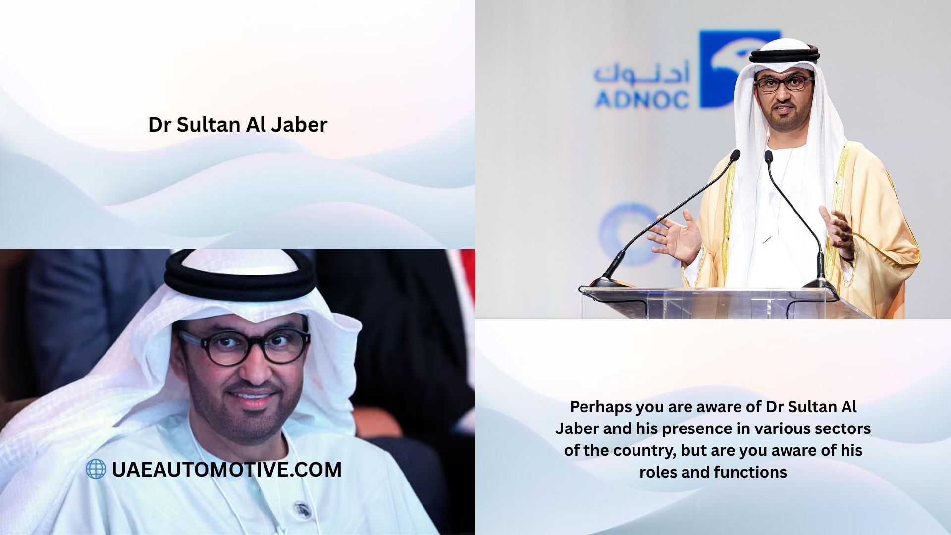A: He is the UAE’s Minister of Industry and Advanced Technology, CEO of ADNOC, and Chairman of Masdar.